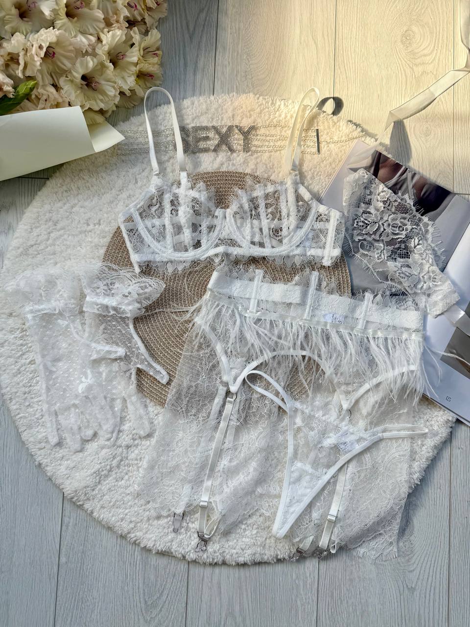 Set obsahuje podprsenka, kalhotky, pas, suken, rukavice.