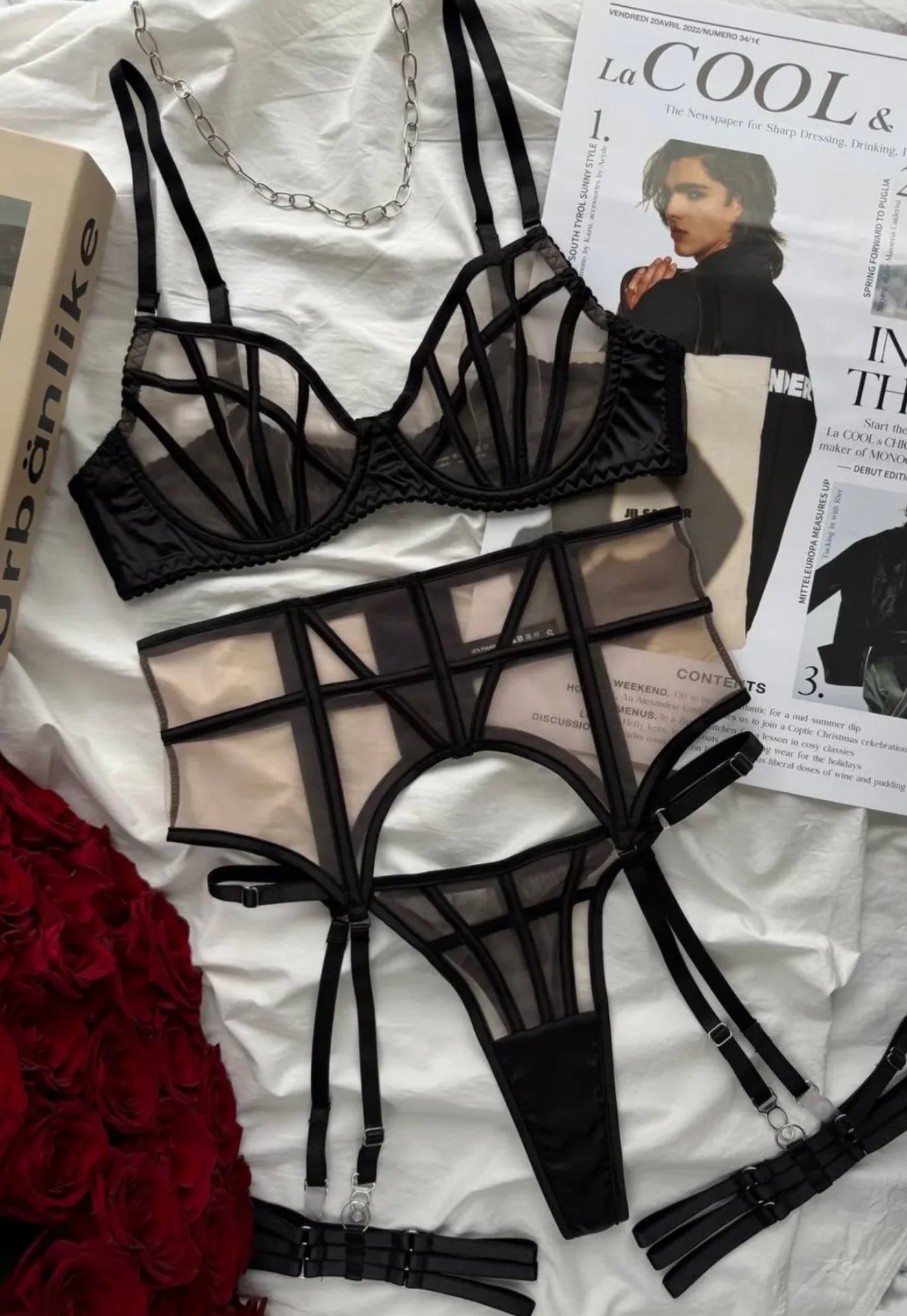 Set obsahuje podprsenka, kalhotky, pas, rukavice a podvazky.