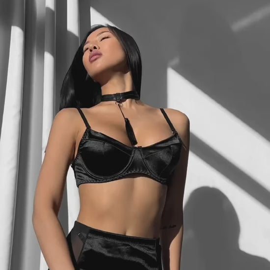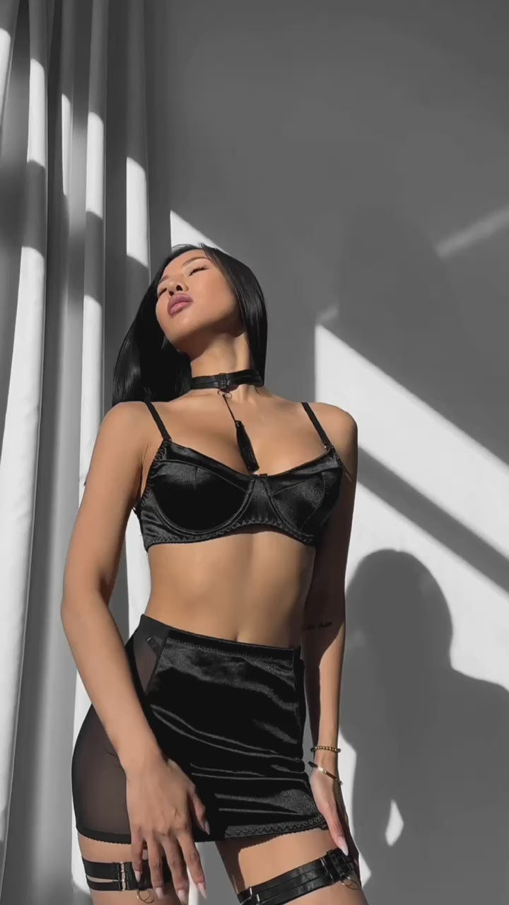 Set obsahuje podprsenka, kalhotky, suken, choker a podvazky.