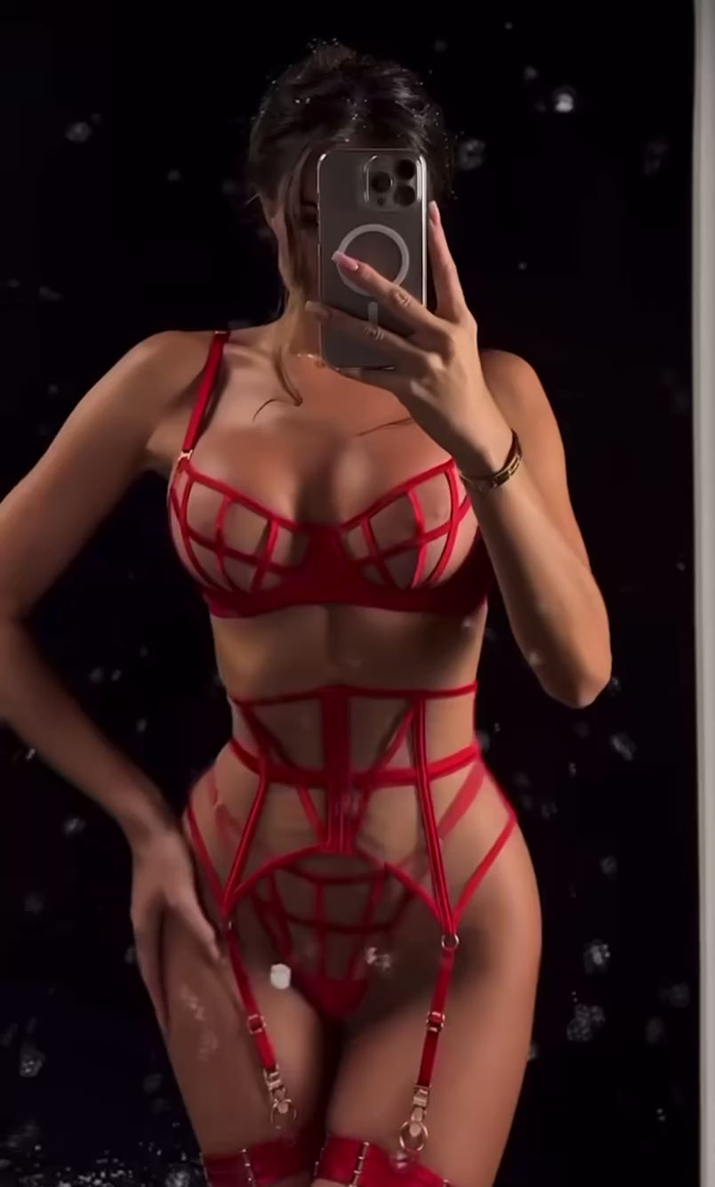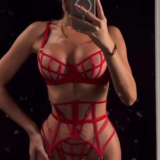 Set obsahuje podprsenka, kalhotky, pas, rukavice a podvazky.