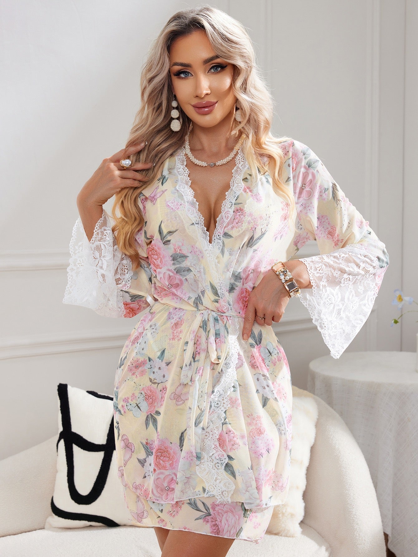 Tato elegantní a jemná pyžamová sada je určena pro ty, kteří si cení pohodlí a krásy. Měkká, průsvitná látka s romantickým květinovým potiskem vytváří sofistikovaný a vzdušný vzhled. Horní díl má tenká ramínka s krajkovým lemem a jemnou mašlí uprostřed. Součástí je lehký župan s širokými rukávy a páskem a kalhotky, které dotvářejí vzhled a dodávají mu nádech sofistikovanosti.